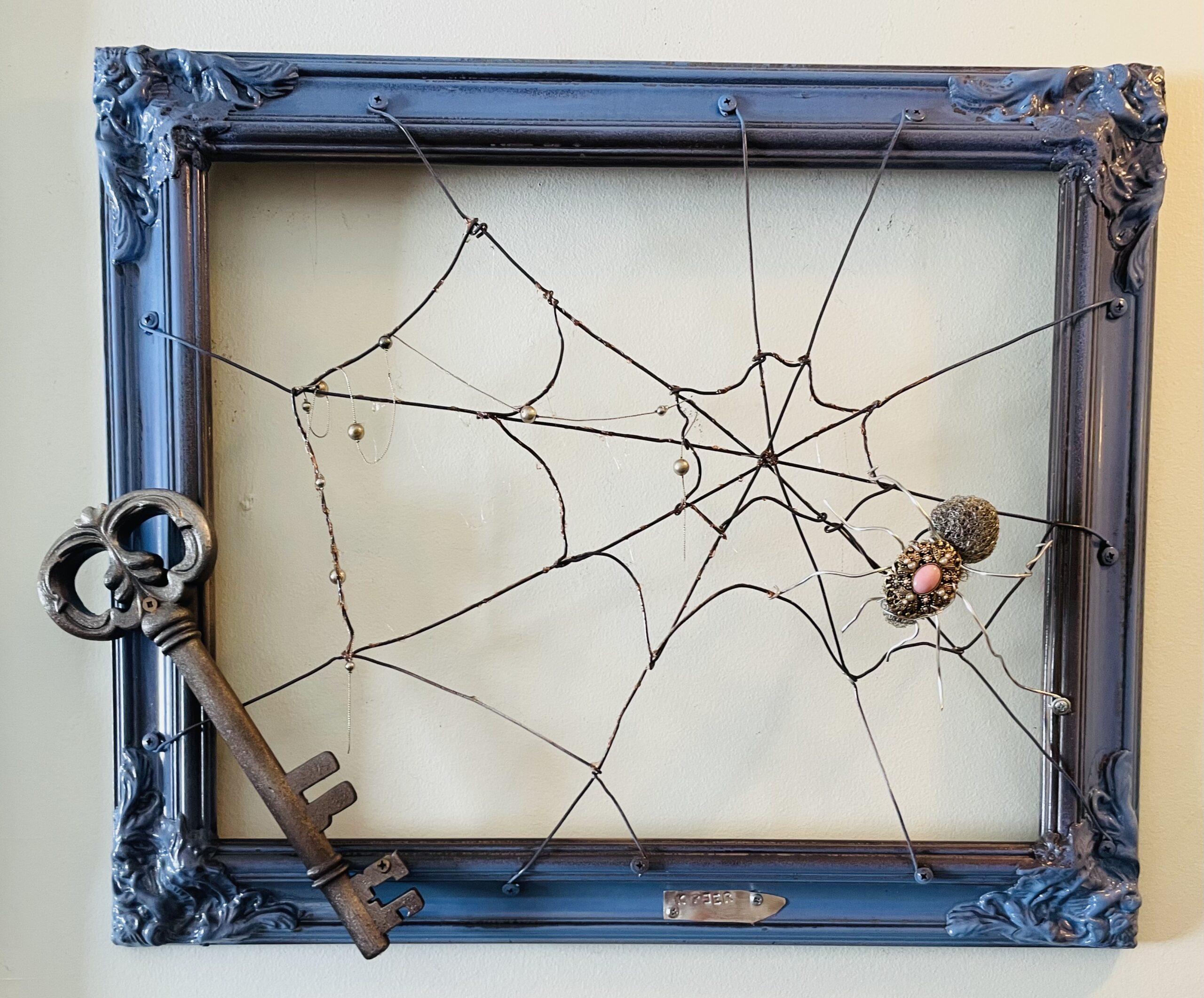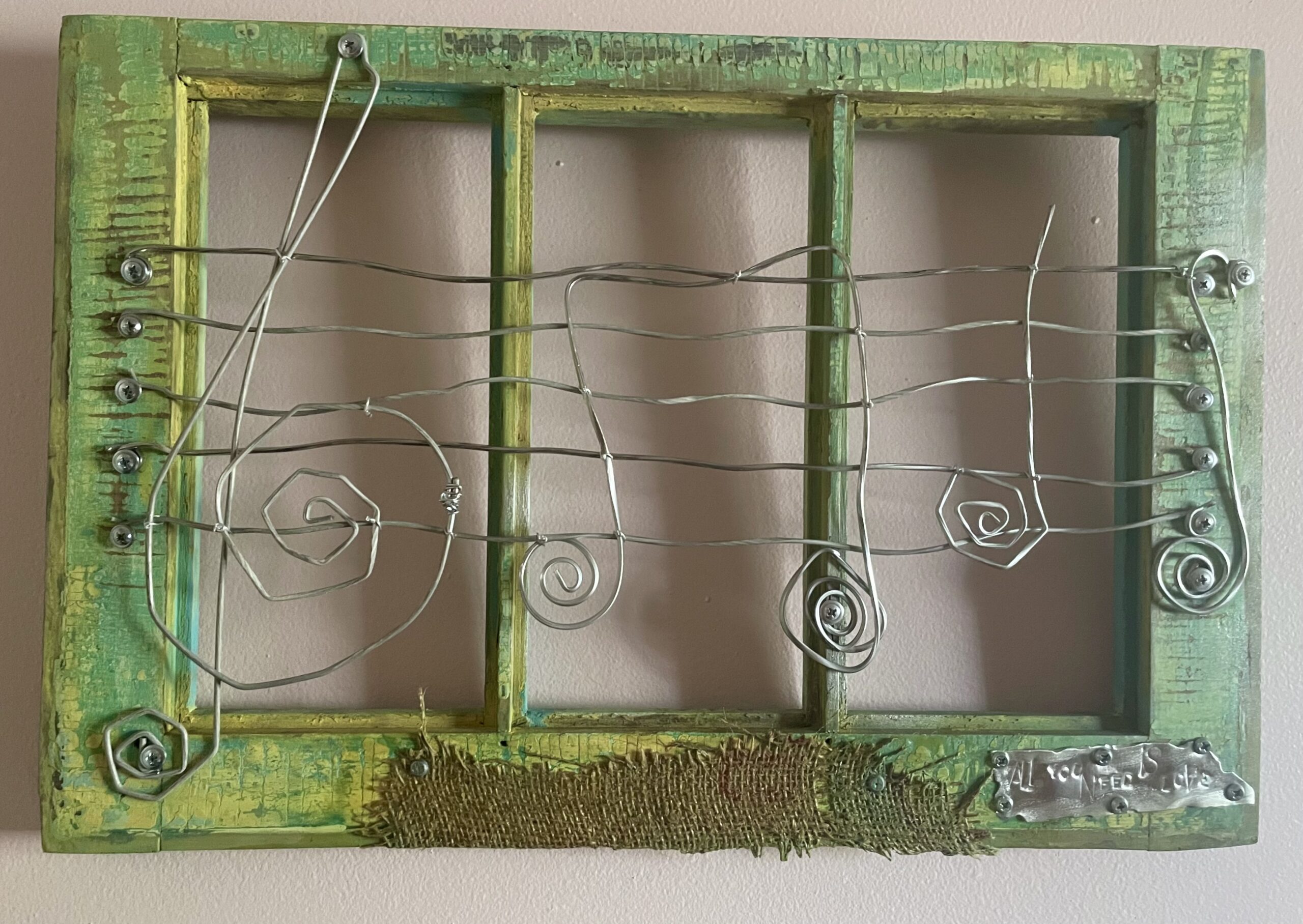 Super unique, lovely vintage fame and bursting with colour this arched frame is truly one of a kind. “Bridge over troubled water” is a 32” x 18” a show stopper, hand tied wire notes meander through the creation it’s a must see.