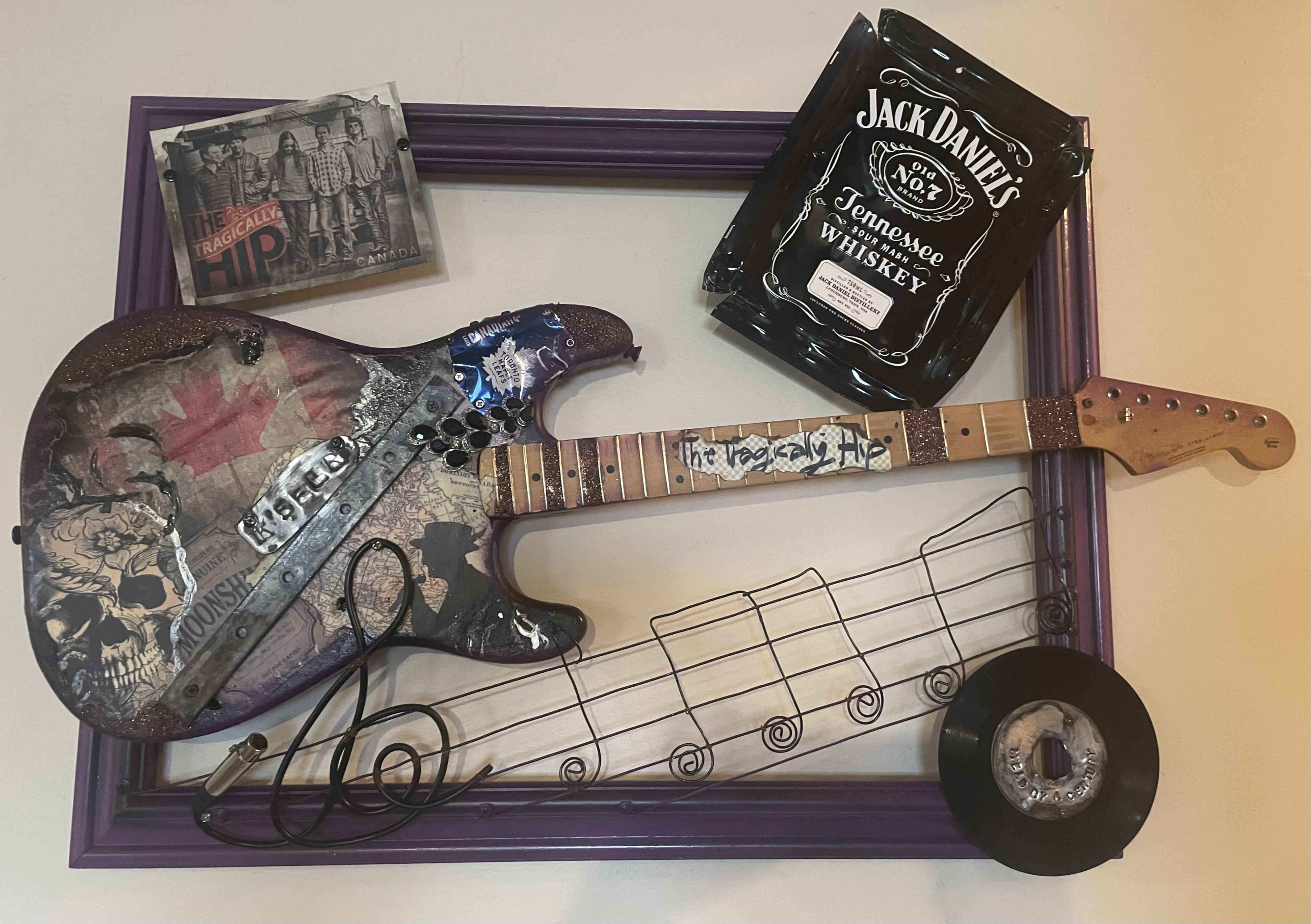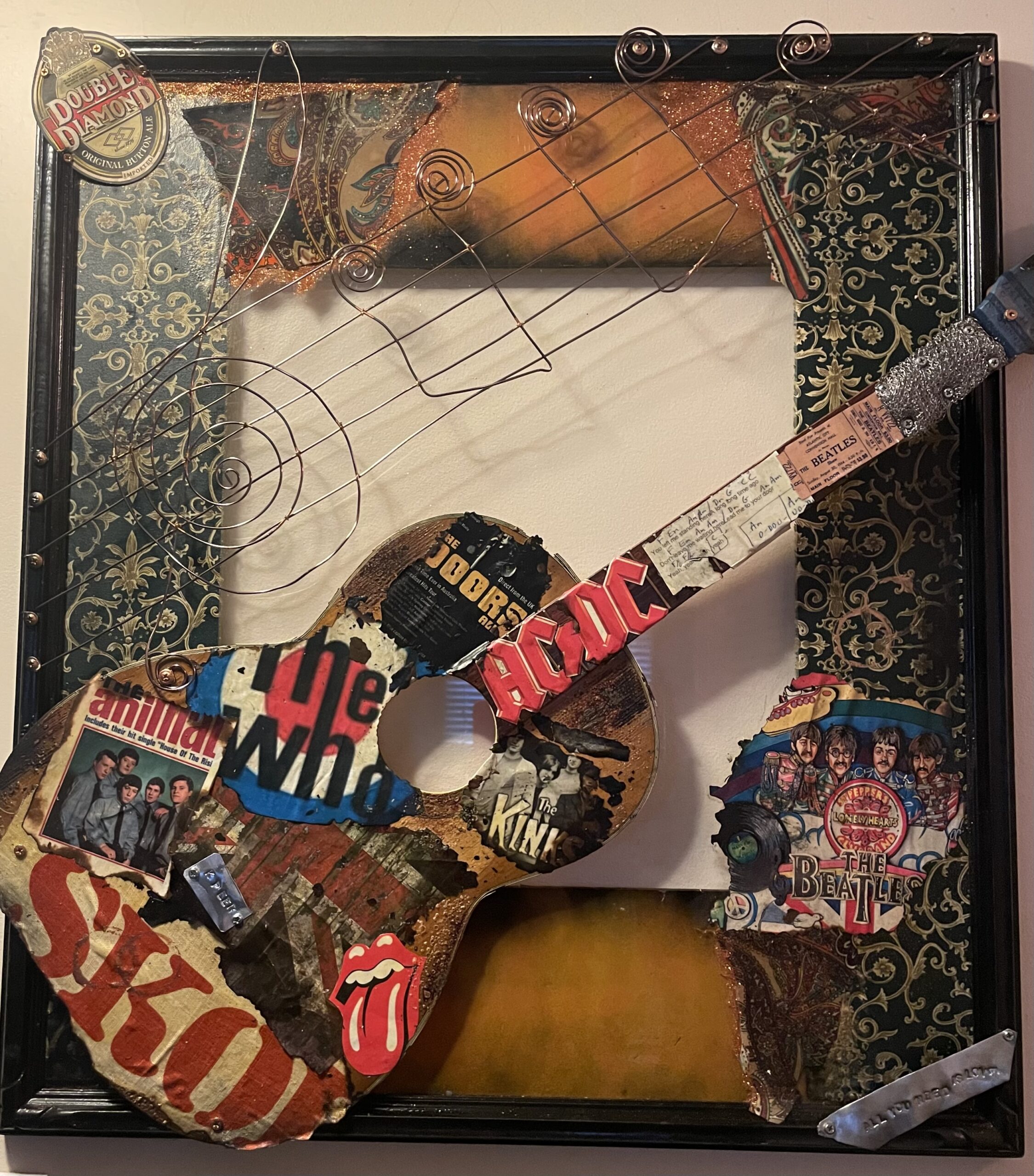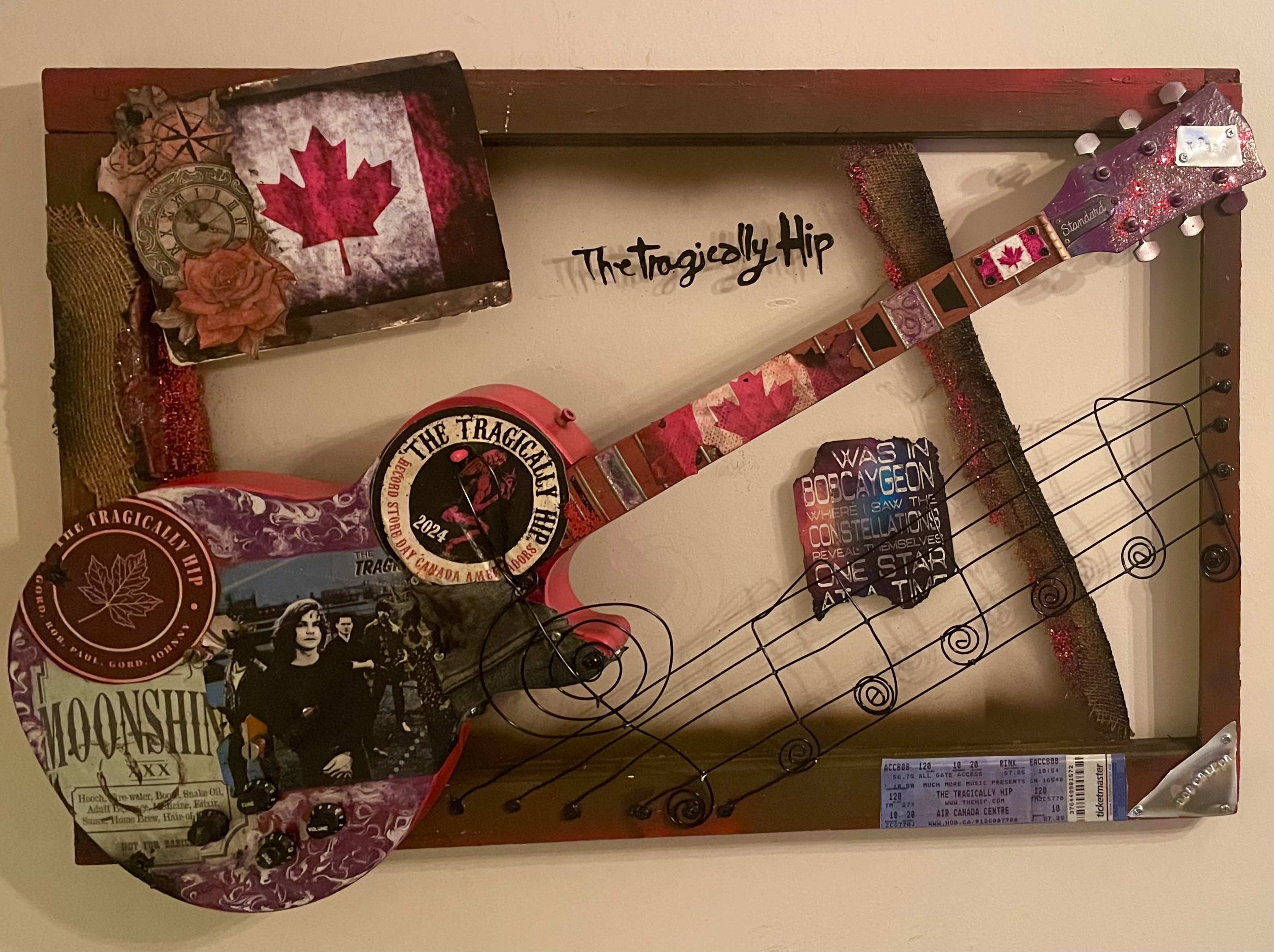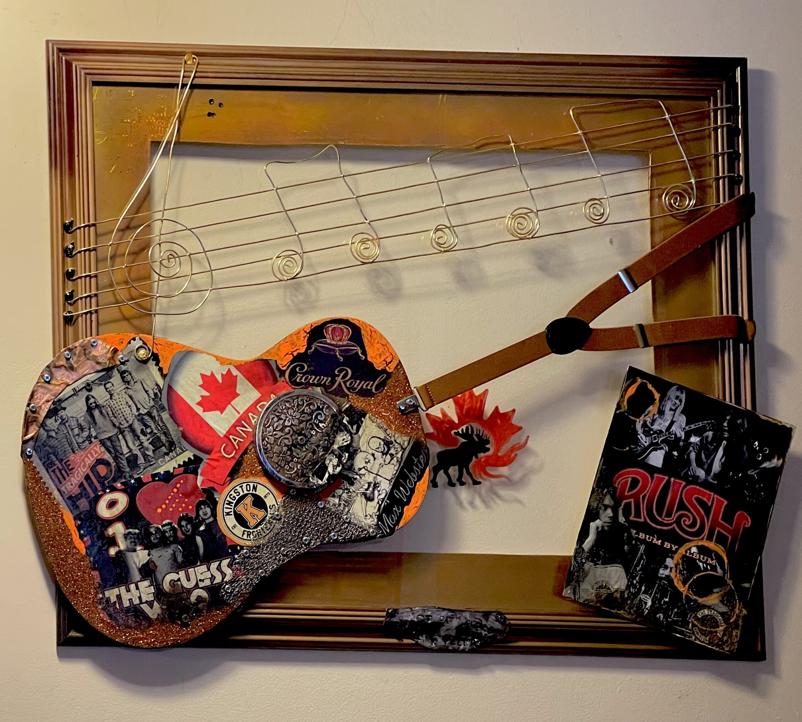 This incredible custom piece was created for a milestone birthday encompassing some of his favourite things. The outside borders are covered with pages from his well travelled passport , maps of special towns and exotic places, plus coins and tokens from foreign countries. The guitar body holds some of his favourite things, music tickets, concerts, the Masters and his favourite group Rush and the song notes of 2112 winding up the neck. At 32”x 40” this creation will make quite a statement adorning the walls in his man cave and was such a pleasure to design.