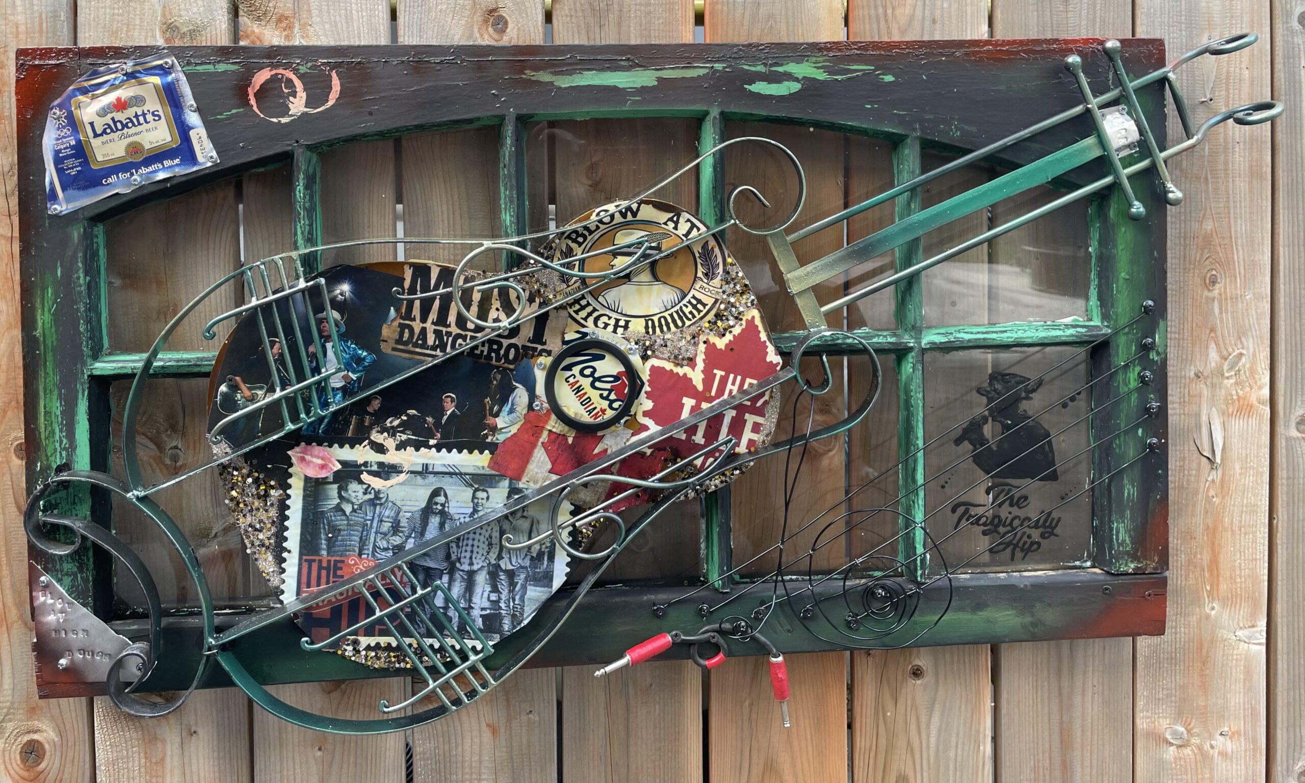 This large 40” x 28” colourful creation is a Harley lovers dream, with a spattering of the notes from the iconic song “Bad to the bone “ running up the neck makes it a real conversation piece. This unique, one of a kind, all recycled, rustic art piece is waiting for a special place to show off.