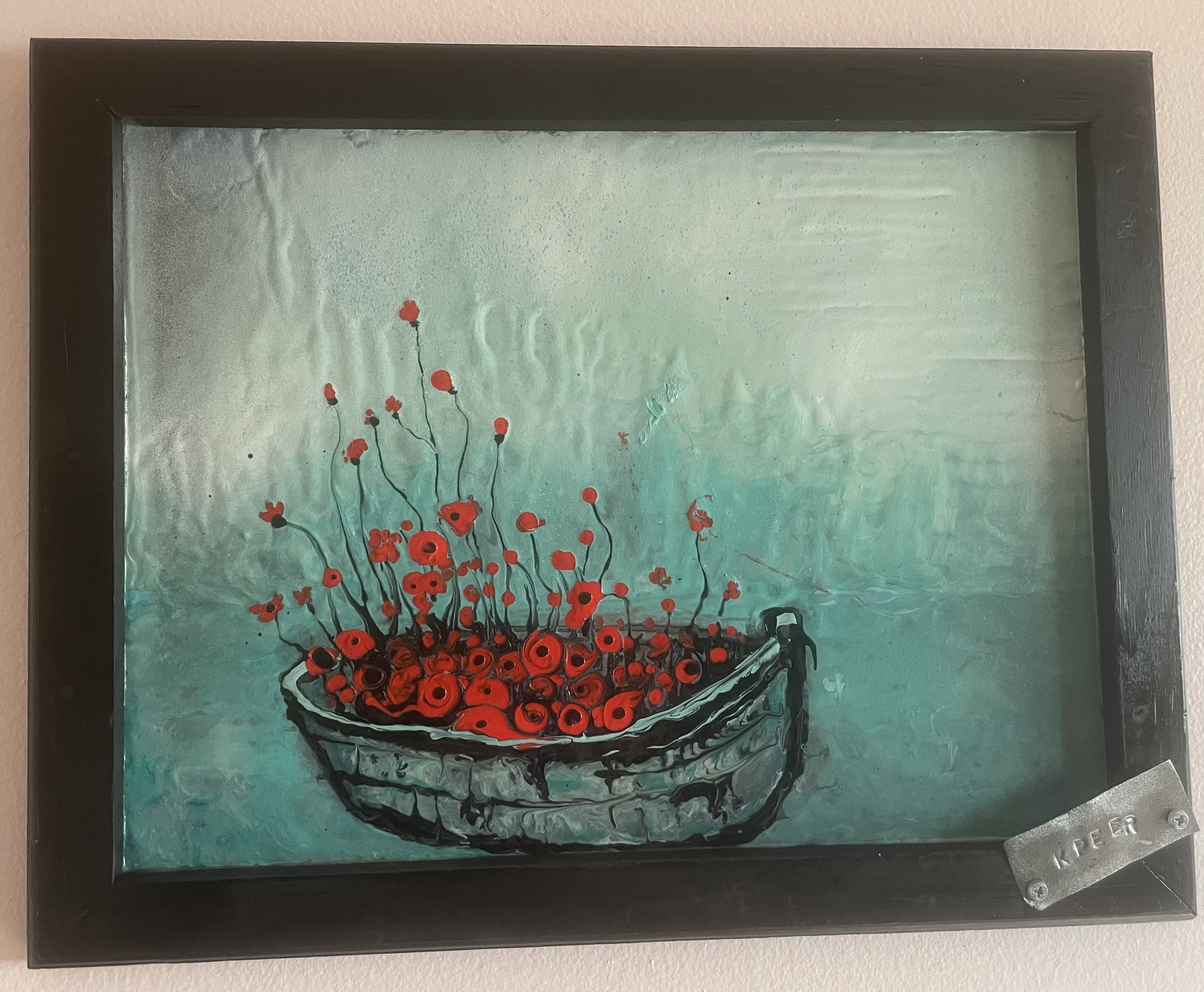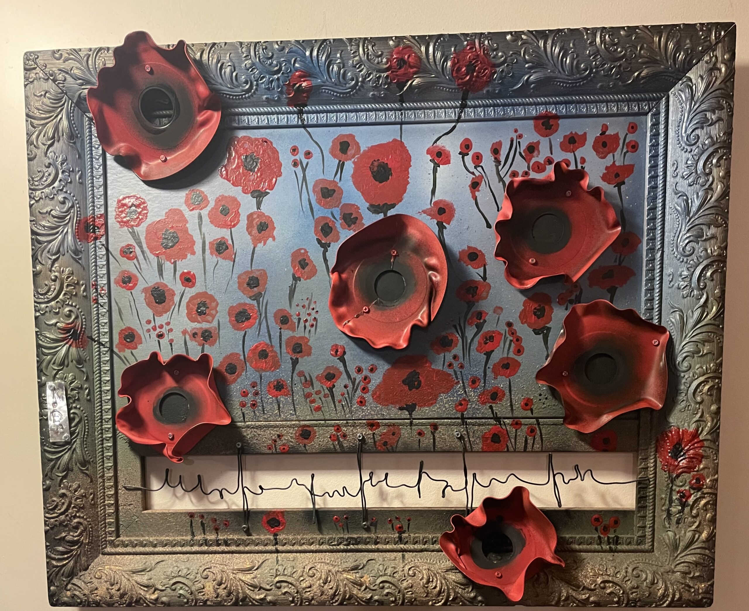 This rustic 40” x 14” vibrant creation of Flanders fields or any other field with its beautiful unique textured poppy’s is a a powerful vision. The horizontal version is a nice change to brighten any bulkhead.