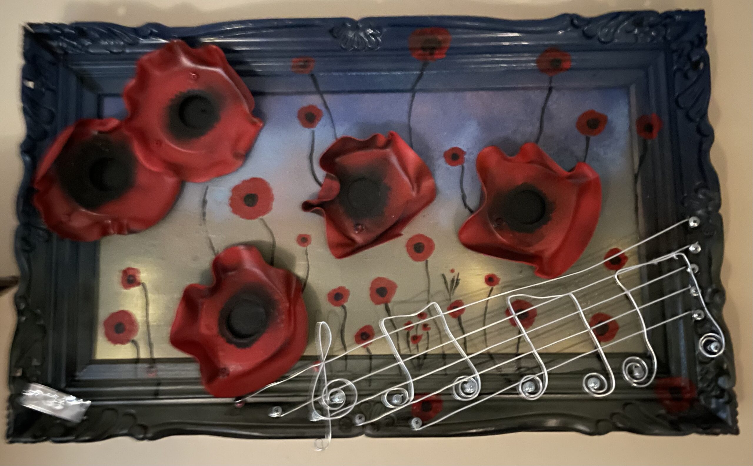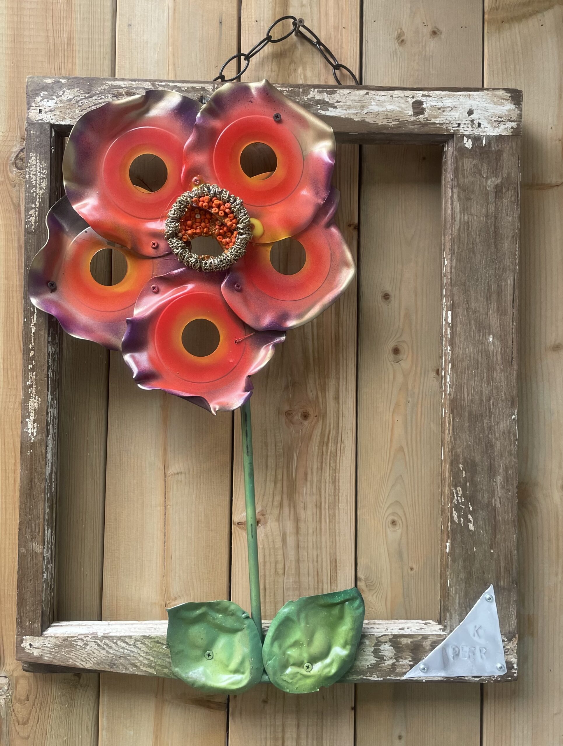 This rustic 12” x 10” vibrant creation of Flanders fields or any other field with its beautiful unique textured poppy’s is a smaller version to brighten and highlight any space it’s shown in. The recycled old 45 records make this piece come to life.