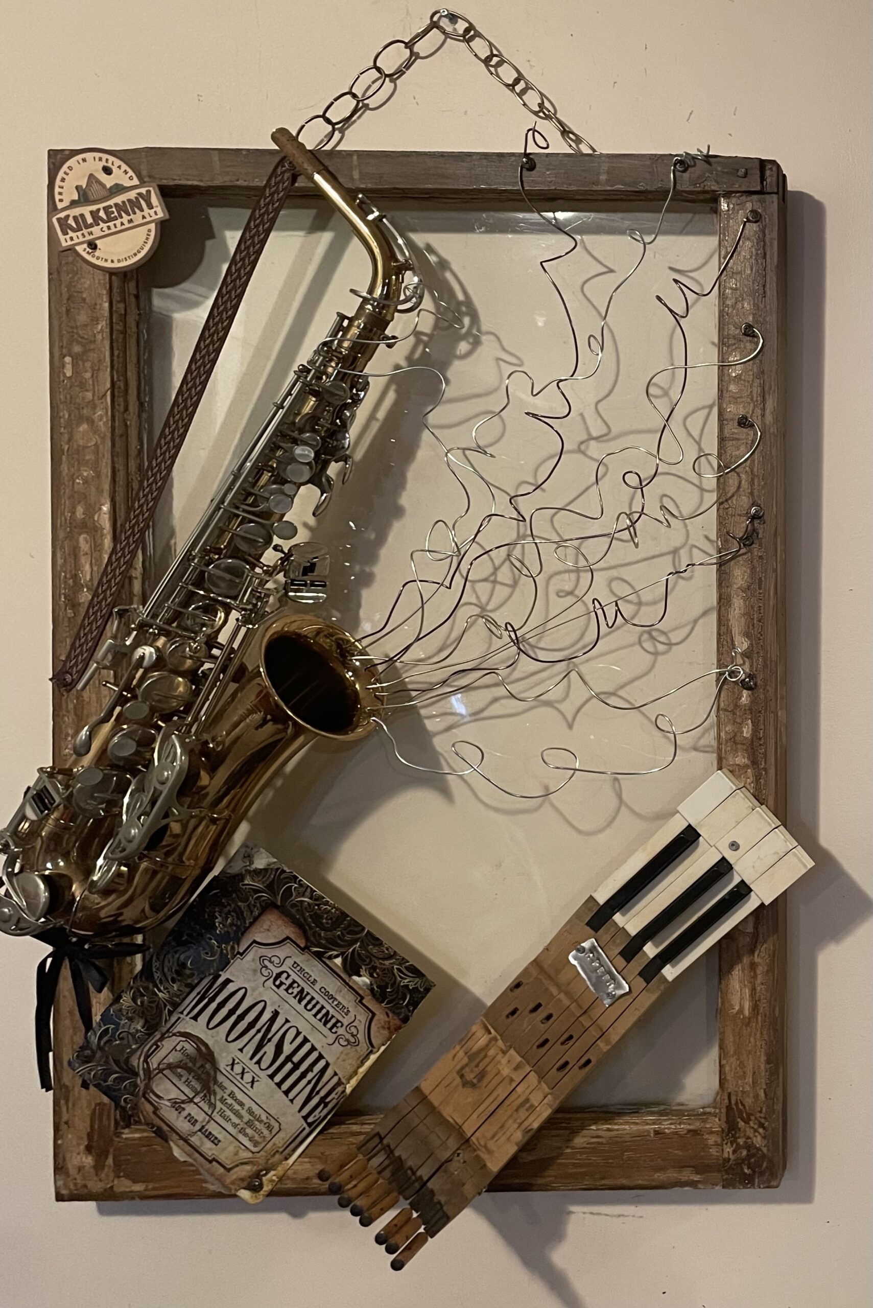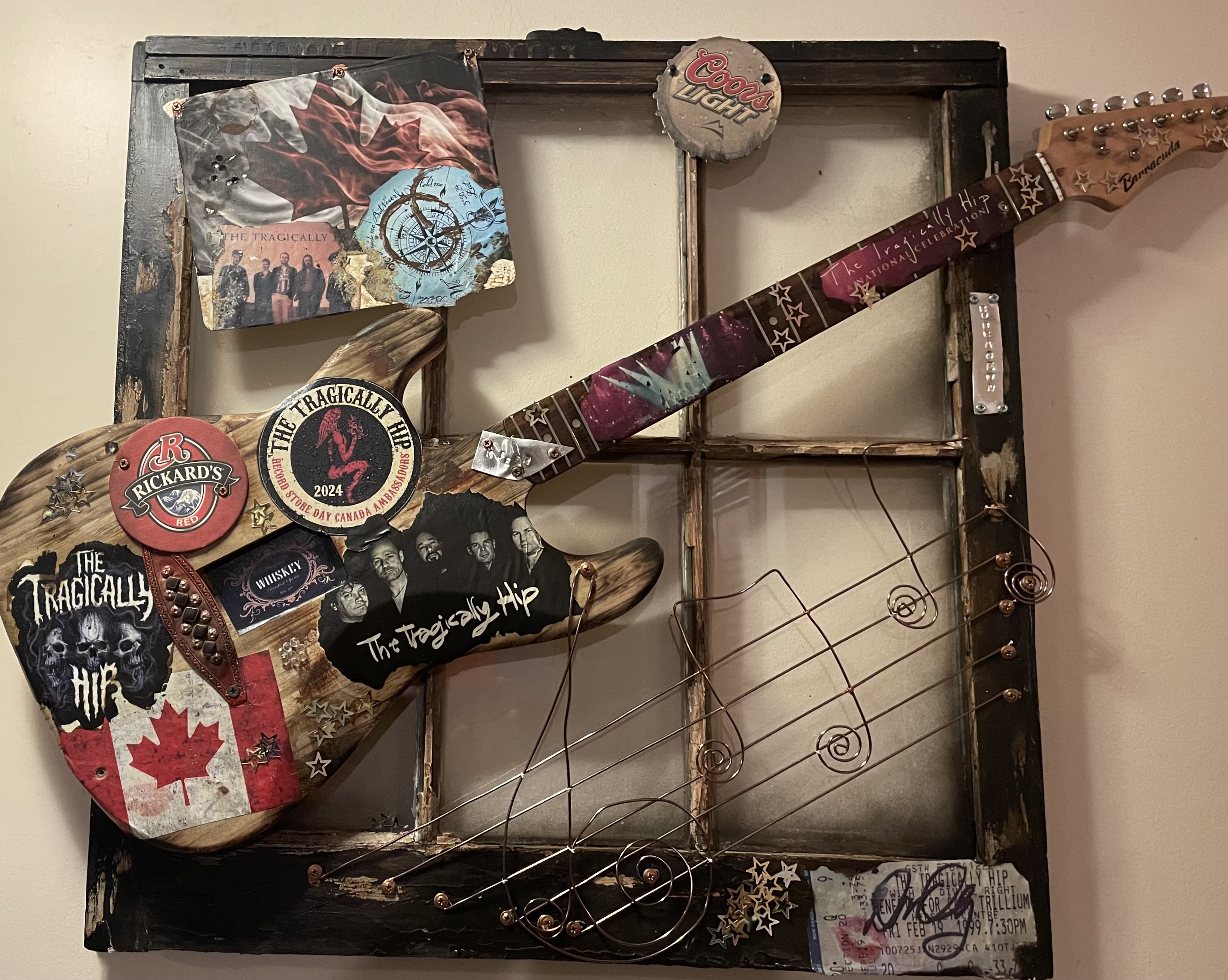 This large 4’ x 2.5’ piece is a custom piece created for a special person who loves and continually supports live music, musicians and artisans. This handmade, rustic, one of a kind incorporates some of his classic country favourites and with its jack chord treble clef and a few hand tied notes of Mama Tried winding across the frame how does it get much better. “The Honky Tonk”