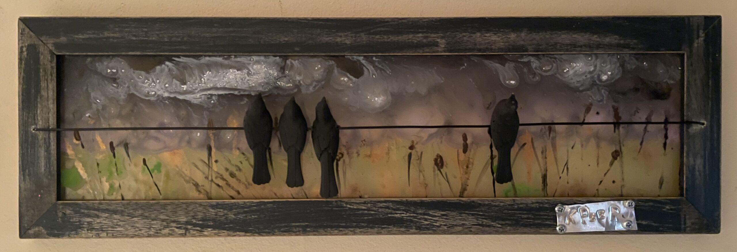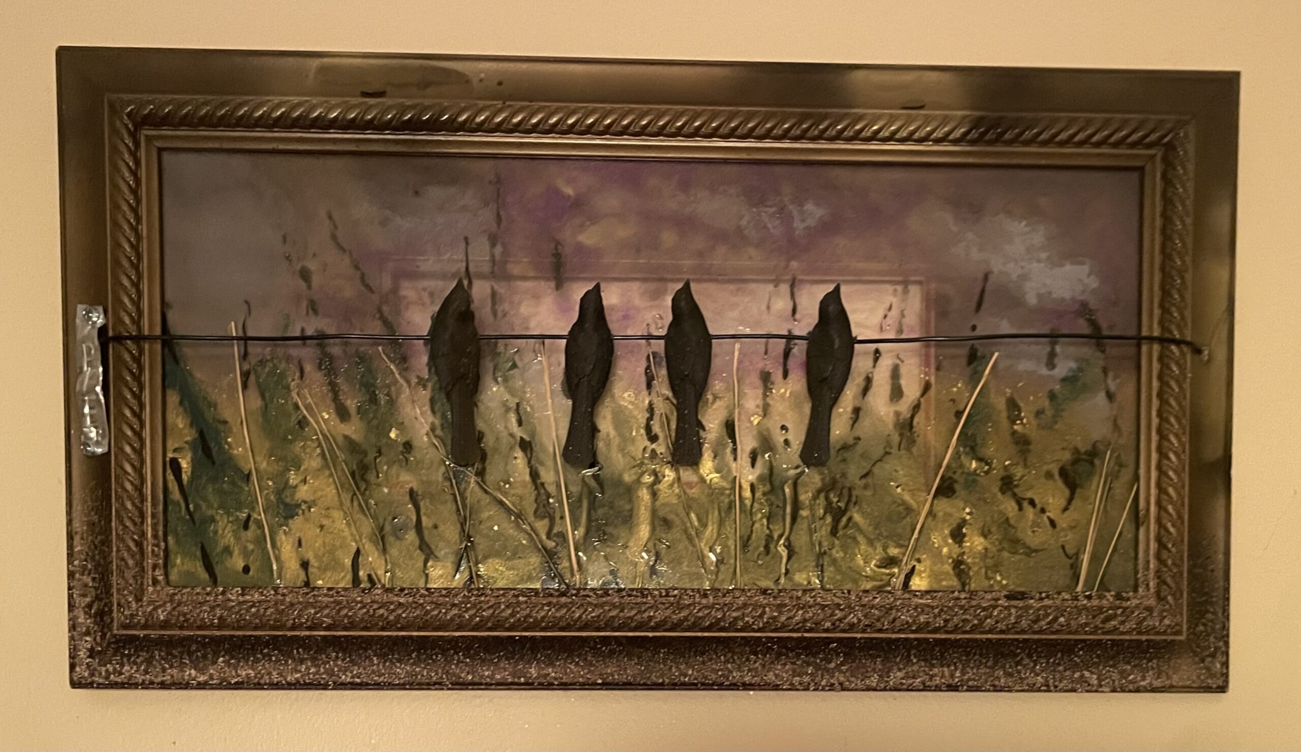 The warm caramelly brown and amber tones of this rural marsh makes you feel right there! “Marsh Birds” is medium sized at 21” x 26” and is completely interactive. The wire and 3D birds give depth to this beauty.