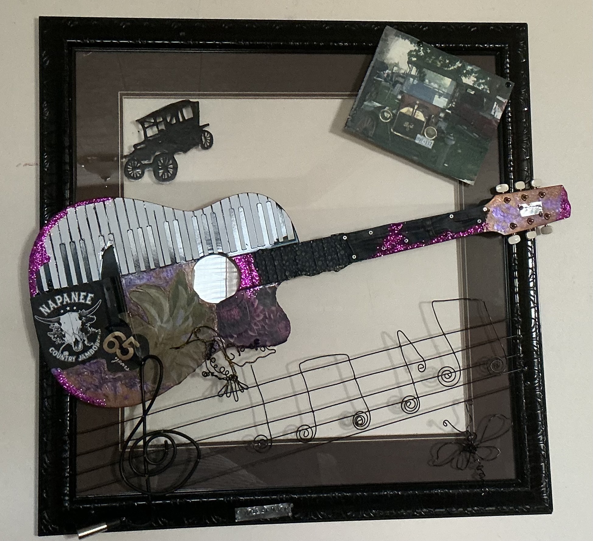 Hi, My name is Karen Peer and have always had a passion for unique and unusual art pieces. I am always happy when working in my Garudio (garage + studio) and welcome custom creations, ideas or commissioned pieces. I especially appreciate music (as we are a musical family) and would love to create a special , multi media, glass and wire art piece to keep your special memories alive and viewable. A couple of examples would be my hubby’s very first banjo roll he learned when he was a boy, and a lullaby my grandmother sang that has been passed down for generations. I hope you enjoy these one of a kind, handcrafted, rustic art pieces.