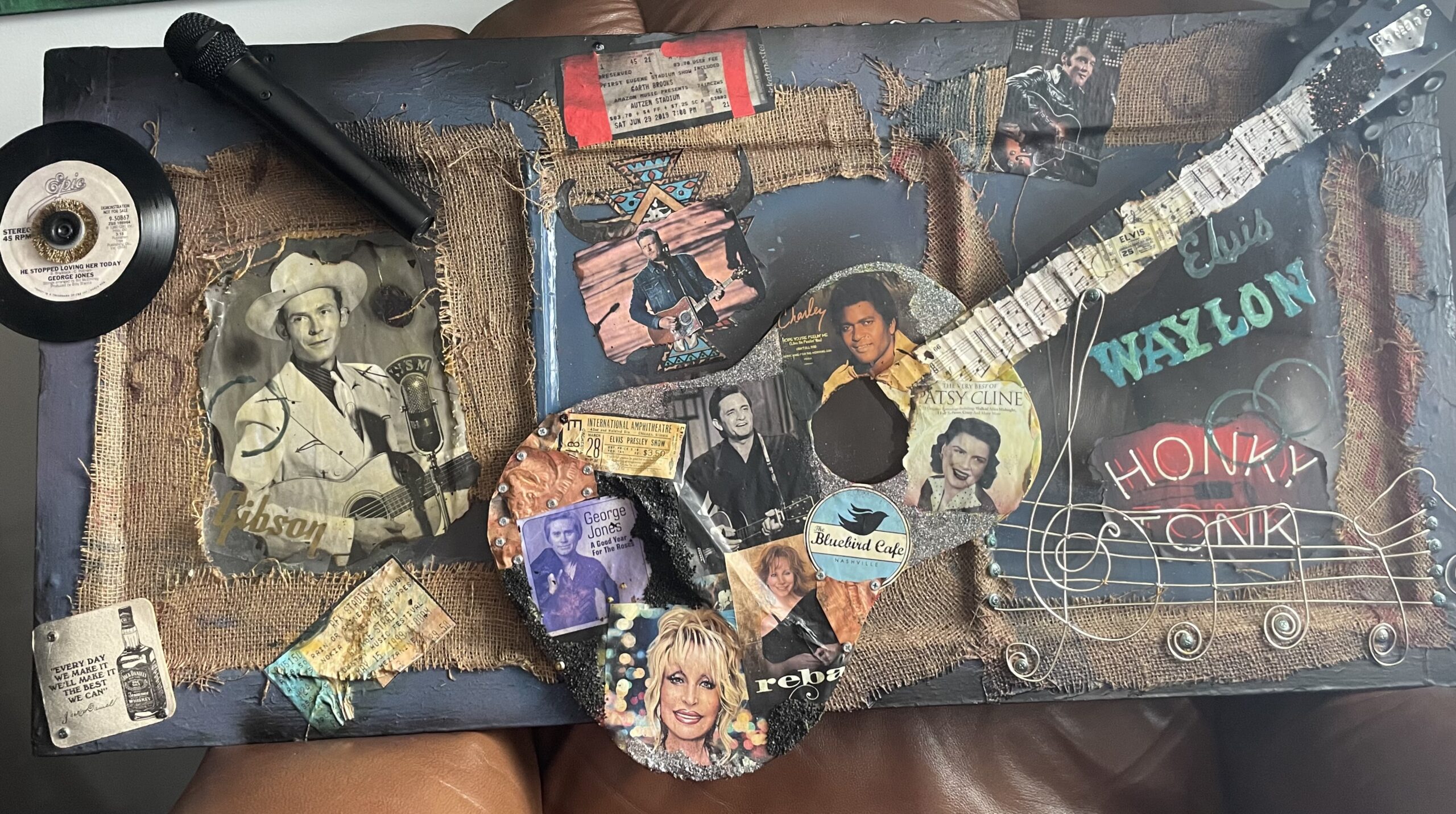 This 29”x 26” piece is pure classic country. The subtle Caramel and bronze tones are set off by the winding copper notes of Dolly Parton’s music classic “Jolene”. It’s rustic , recycled and ready to be shown.