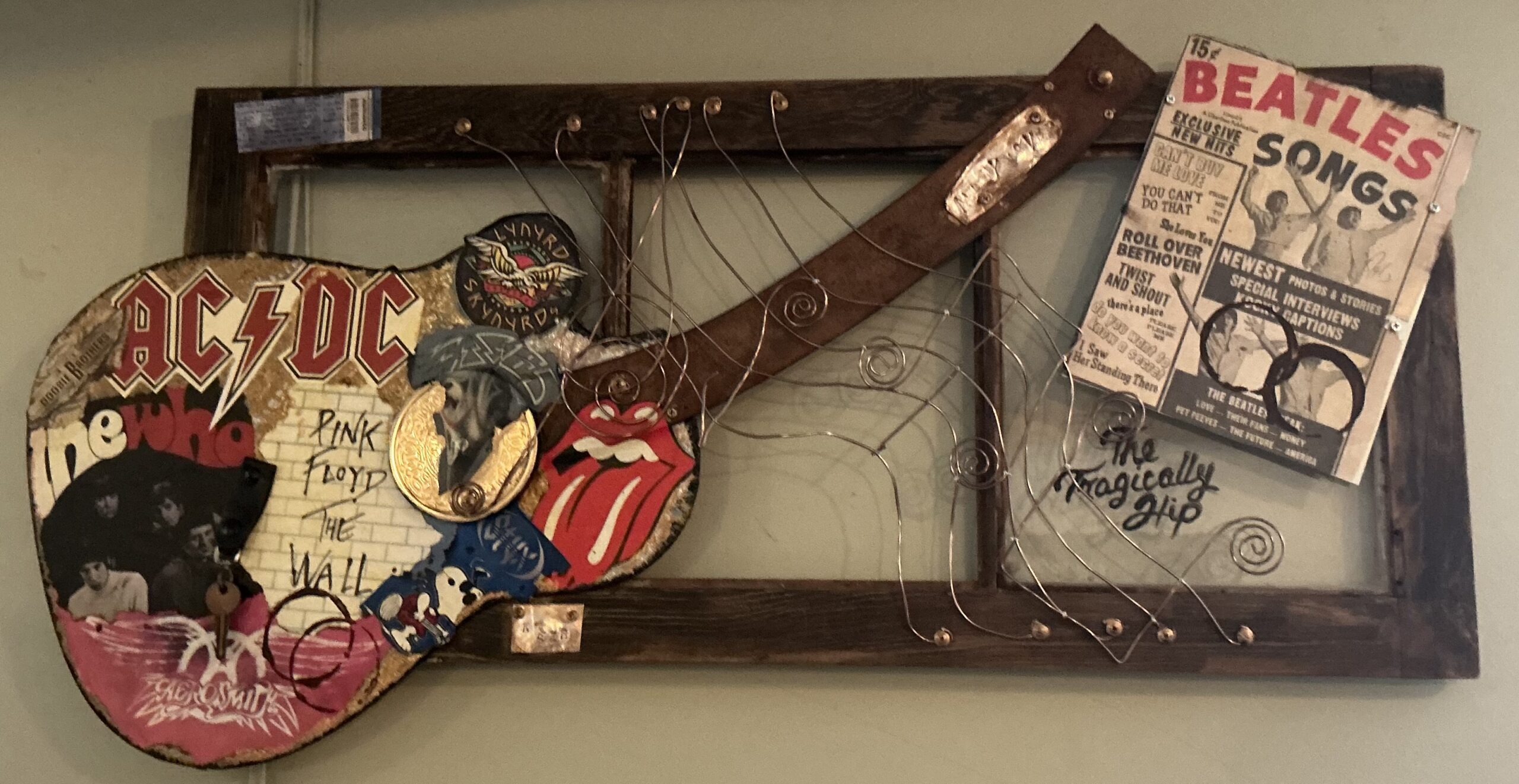 The cream and rosie taupes give this super rustic 14” x 16” a real warm one of a kind , kind a feel. There is no machining on this hand bent, tied, and completely recycled music clip of “Love her madly” and it’s looking for a forever home.
