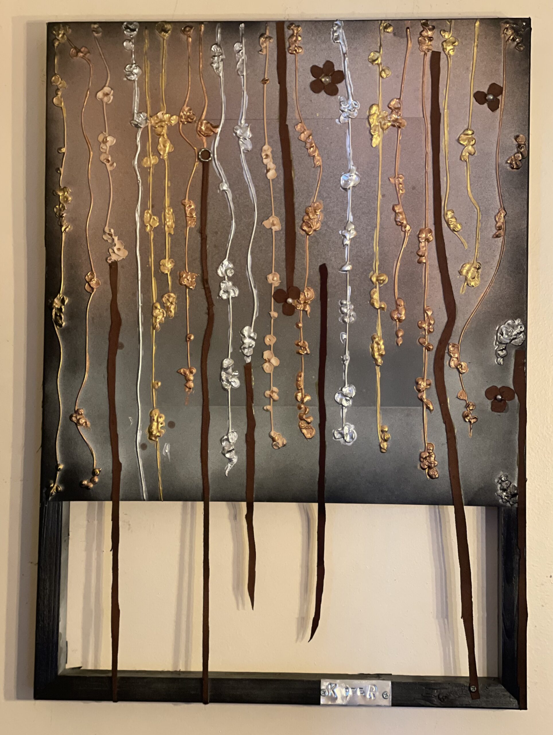 A lovely combination of metallics make this 20” x 26” depiction of trailing blossoms a pretty reminder of summer warmth. I hope you like it as much as I do ☺️.